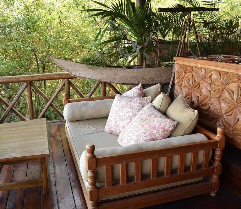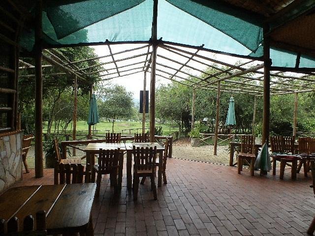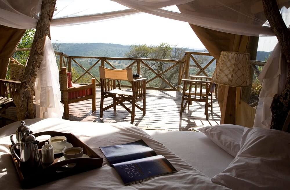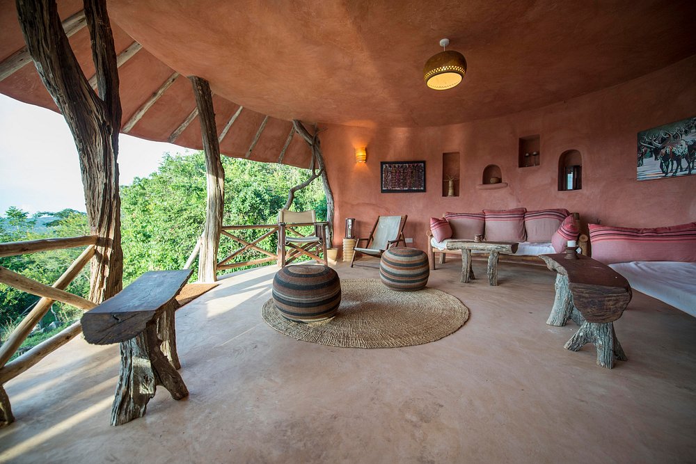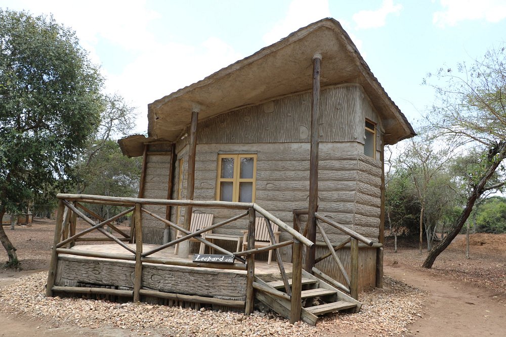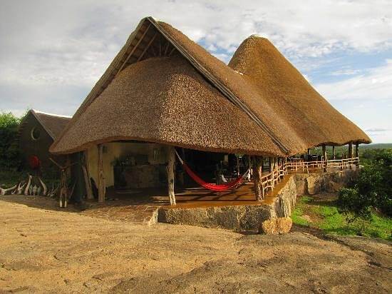 sits atop a hill, providing panoramic views of the park. Its 12 thatched-roof tents feature stone floors, private showers, and eco-toilets. Guests can enjoy bush sounds and wildlife sightings from their private verandah. The on-site bar and restaurant serve meals that can also be delivered to the rooms.